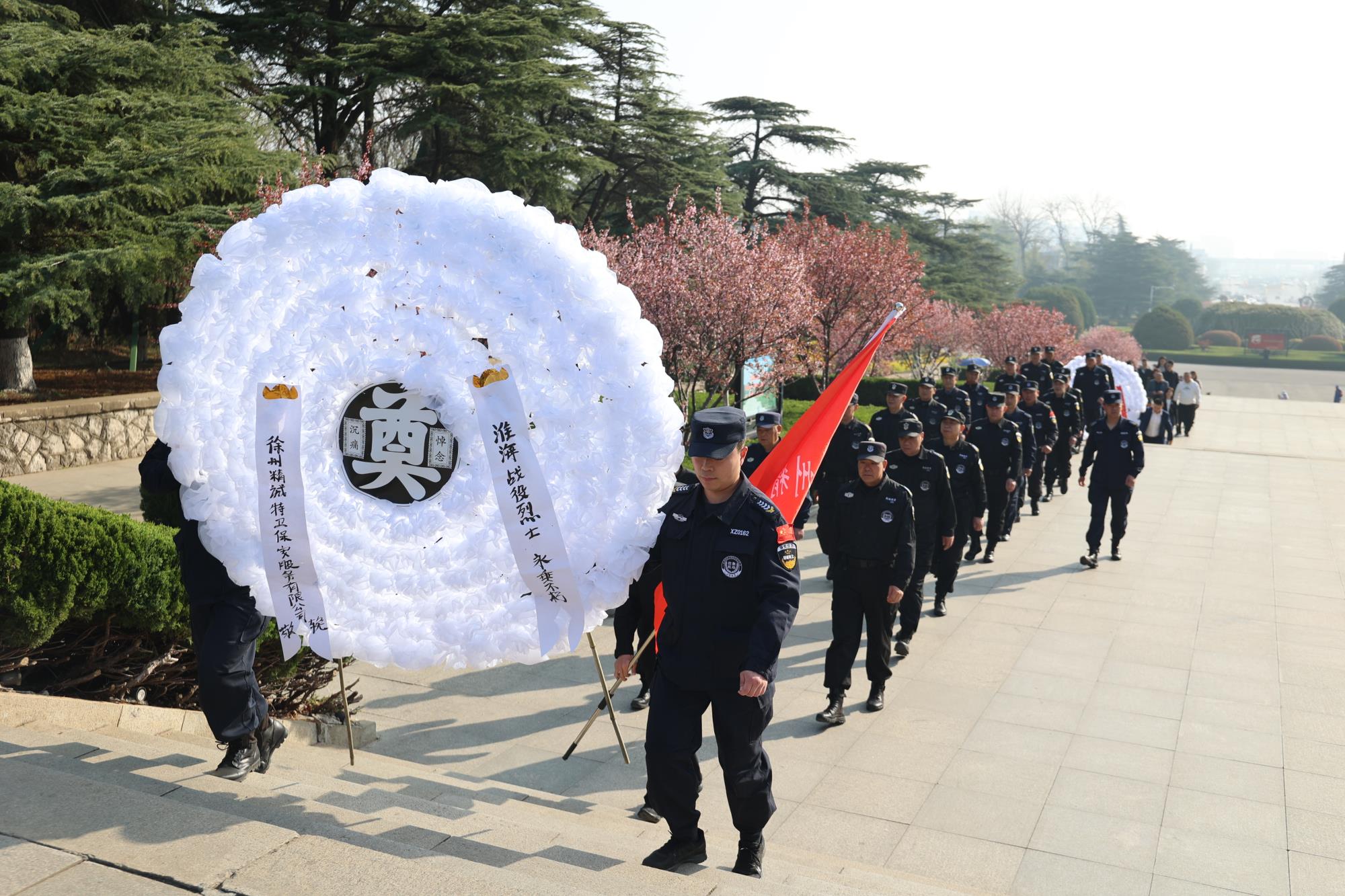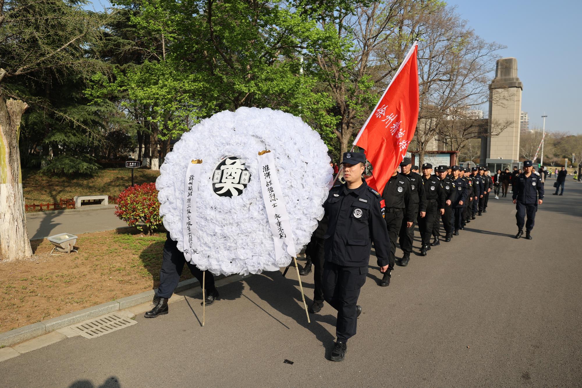 上午8时,沐浴着暖暖的春风,在精诚特卫董事长王海波的带领下,全体保安队员怀着对烈士的无限崇敬的心情来到淮海烈士纪念塔前。苍松翠柏环绕的纪念塔显得格外庄严肃穆,队员们静静地肃立在纪念碑前,神情肃穆,向革命烈士敬献花圈并默哀一分钟。大家绕塔一周,驻足瞻仰塔基上的场景浮雕,当年淮海战役壮观的场面和战士们视死如归的气势仿佛重现在眼前。观详烈士名录,怀想革命先辈们浴血奋战的历史,不无感叹革命先烈英勇无畏的壮举。严守纪律、团结奋战、不怕牺牲、勇于奉献的精神深深触动着在场的每一个人。