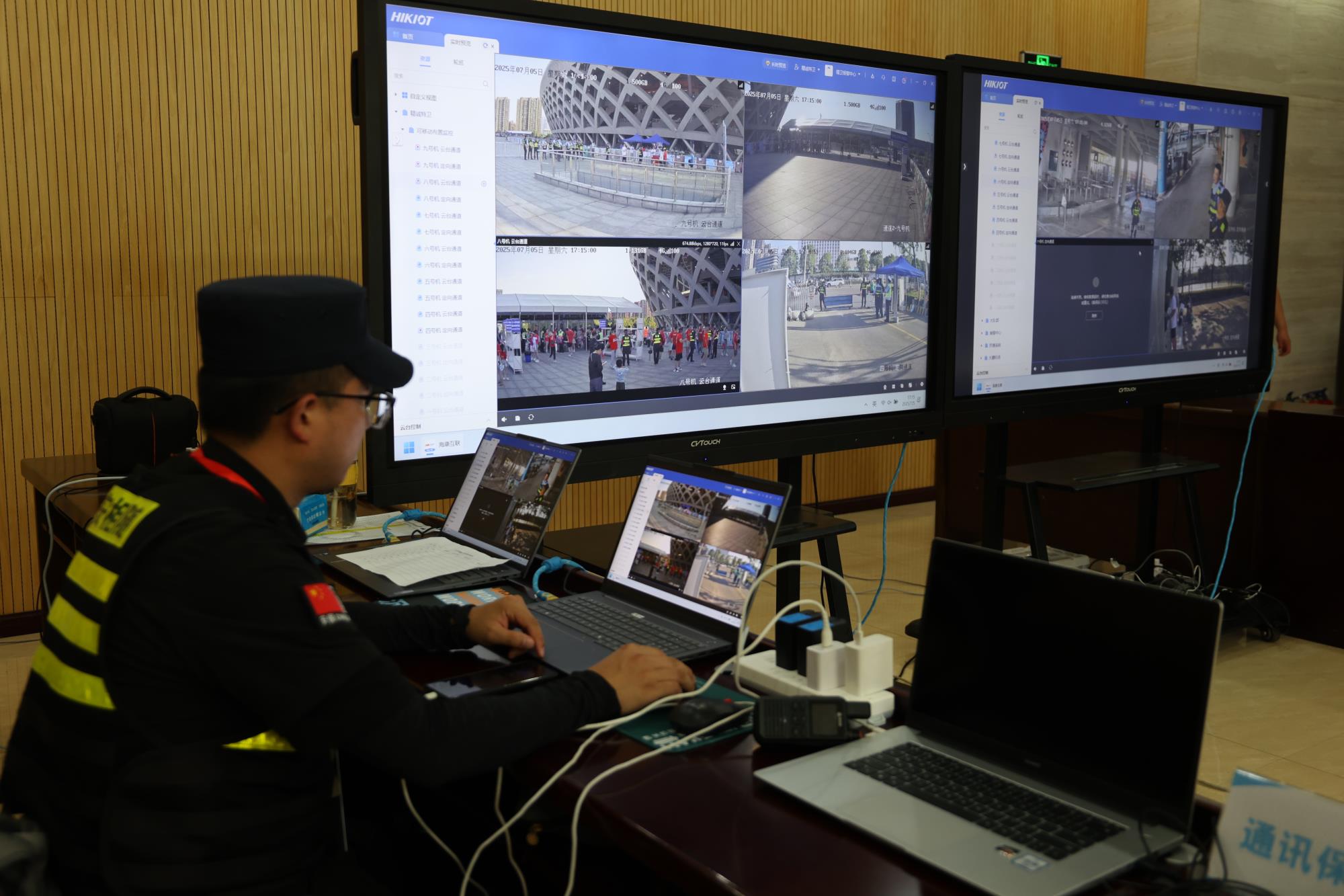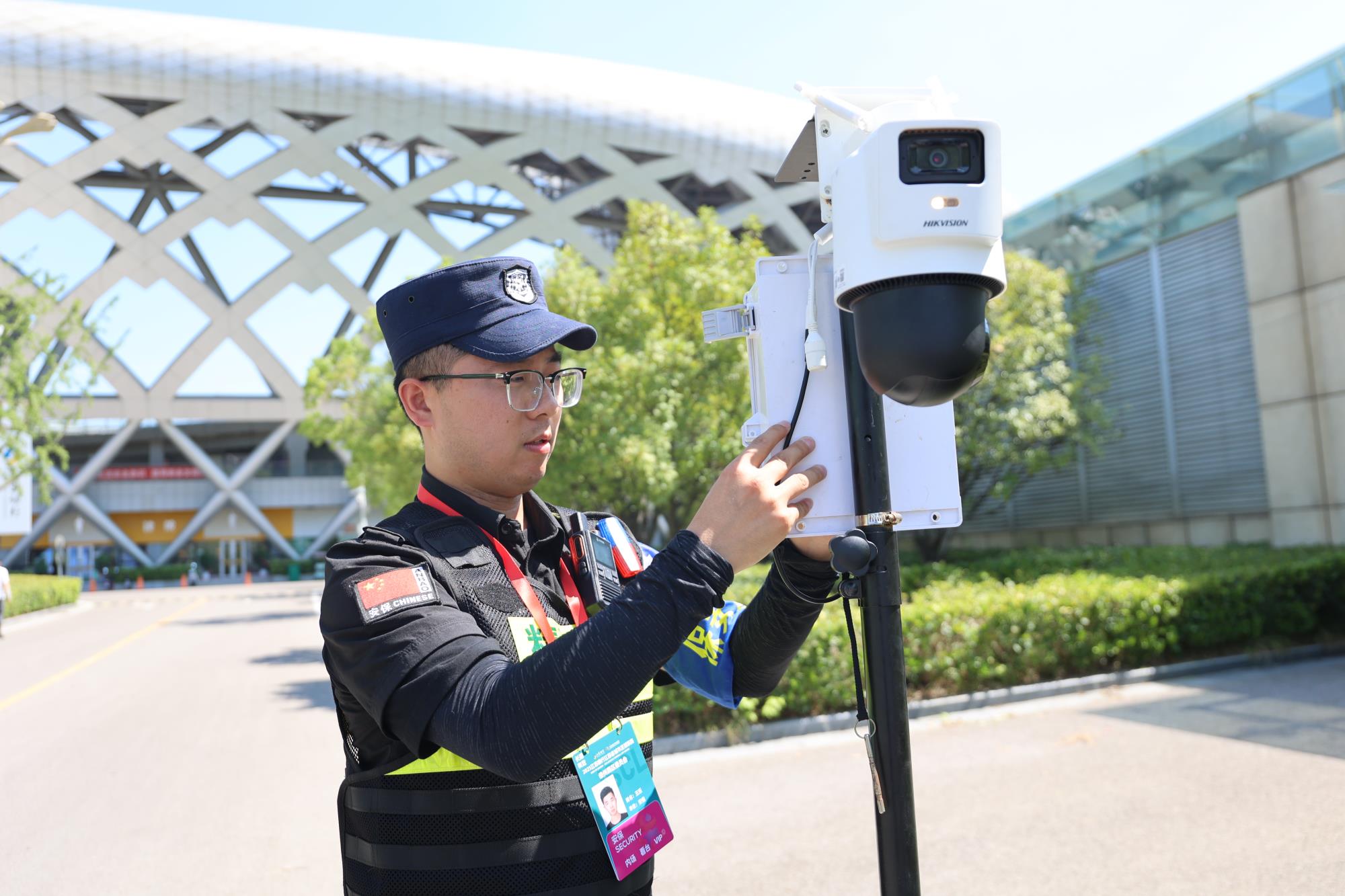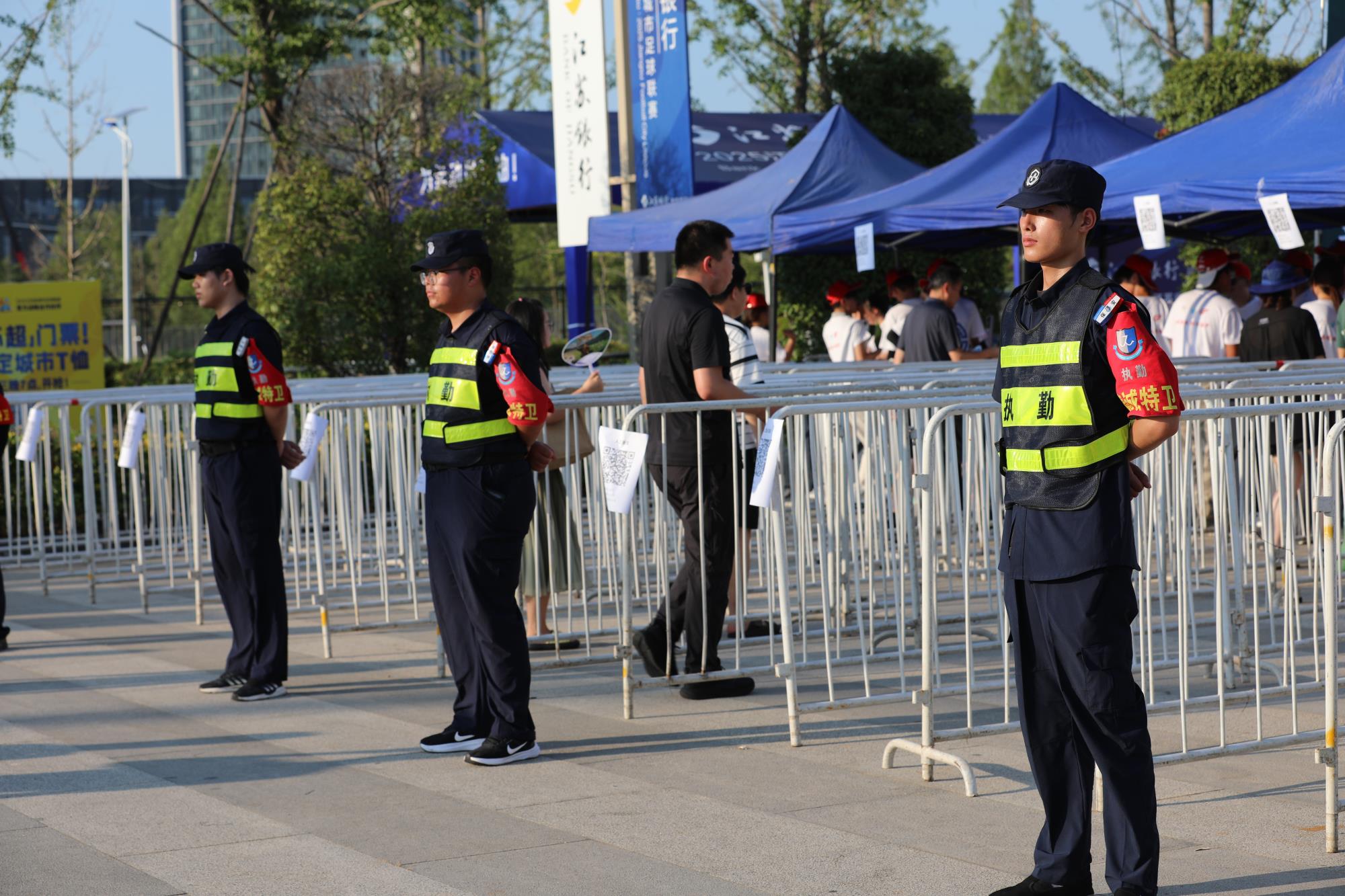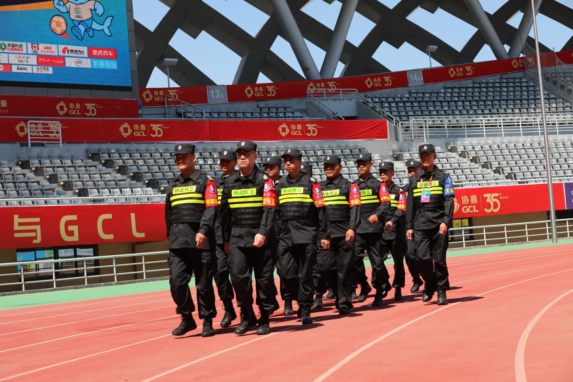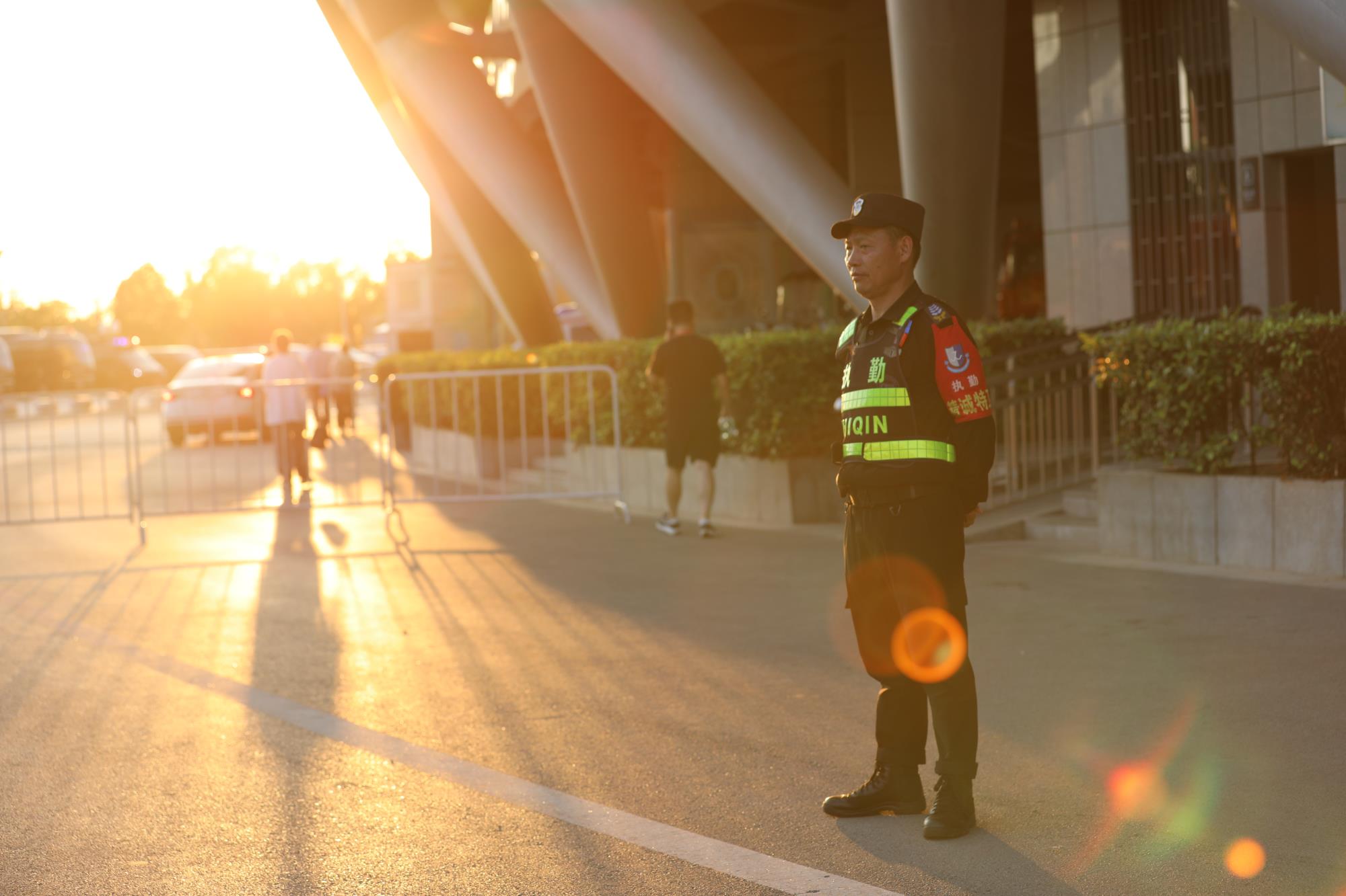 精诚特卫围绕秩序维护、交通保障、应急处置等方面,严密制定安保方案,明确工作职责和任务分工,出动安保力量1000名,安检门64扇、X光机13台、移动监控8个、无人机反制设备4套以及机器巡逻狗等设备,科技赋能全力保障赛事秩序。