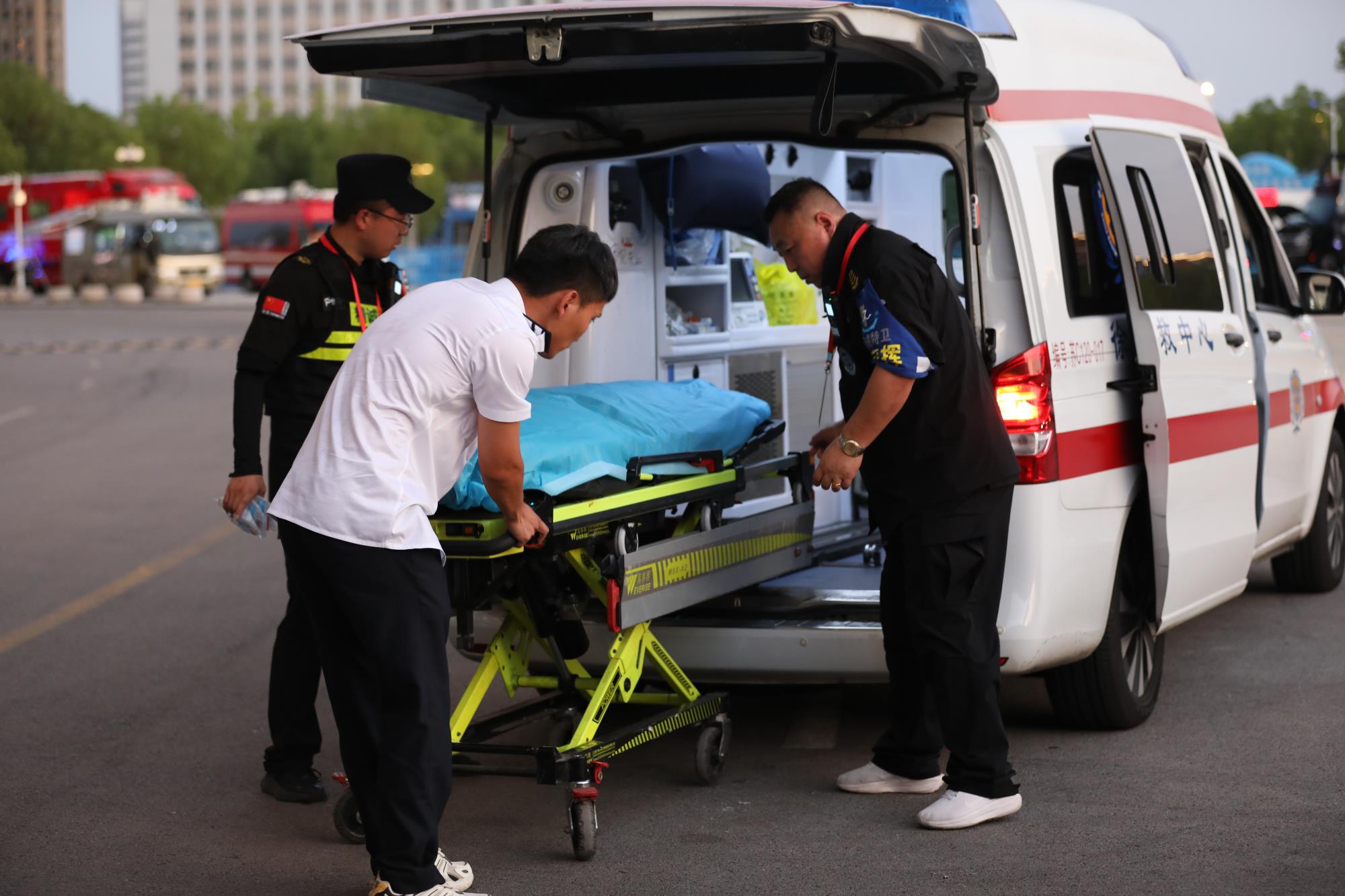 “救护车在哪里、救护车在哪里,有人摔倒了”,十几米外,一名辅警急匆匆的跑过来,站在保安指挥部门口的董事长王海波与总经理助理王乐毫不犹豫冲上前去,沉稳协助120急救人员抬卸担架,争分夺秒的生命救援在酷暑中无声展开——这仅是一场高温下专业守护的序幕。