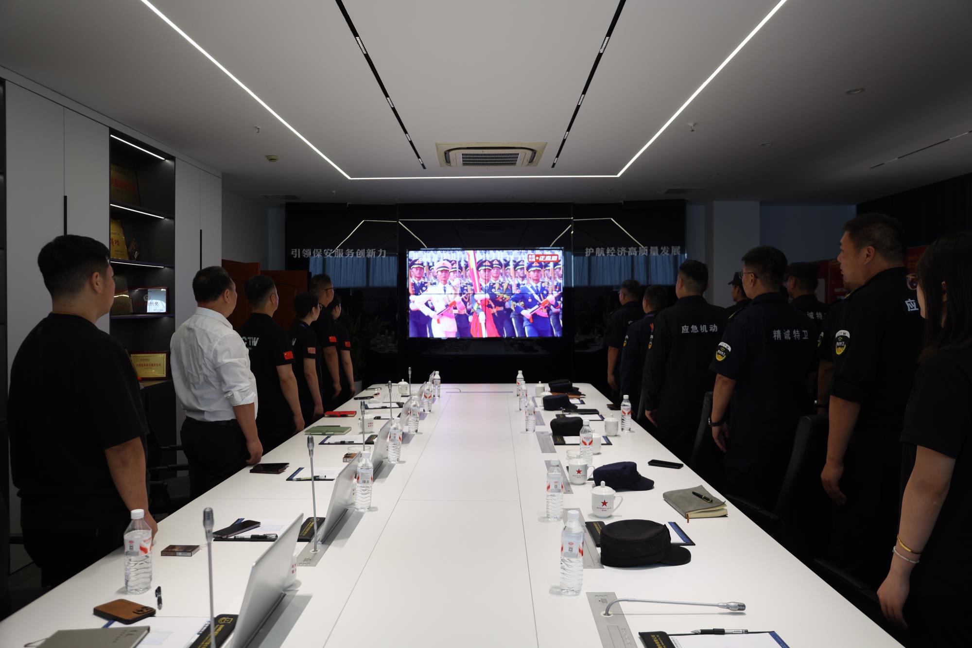 为纪念中国人民抗日战争暨世界反法西斯战争胜利80周年,深入贯彻爱国主义教育,激发全体员工的国家荣誉感与使命感,徐州精诚特卫保安服务有限公司于9月3日上午在总部会议室隆重举行“观阅兵盛典·铸忠诚担当”主题活动。公司董事长王海波、党总支书记、副总经理郑兆关及各部门负责人、党员等40余人齐聚一堂,集体观看这一历史性盛况,认真聆听习近平总书记的重要讲话,共同见证这庄严神圣、激动人心的时刻。